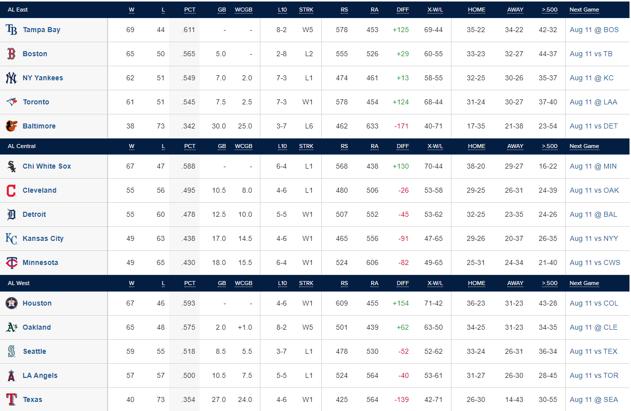 AL 전체 1등 탬파베이 69승 44패 .611